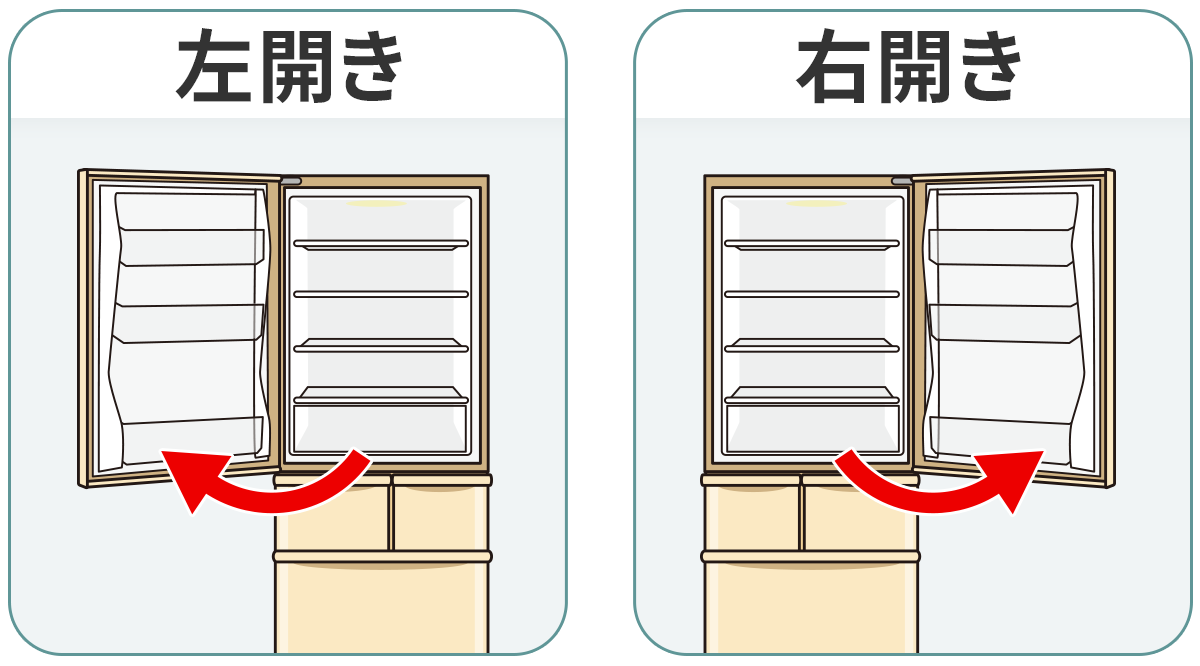 冷蔵庫を正面から見たときに、扉の左側が固定されており、扉が左側へ開きます。